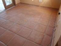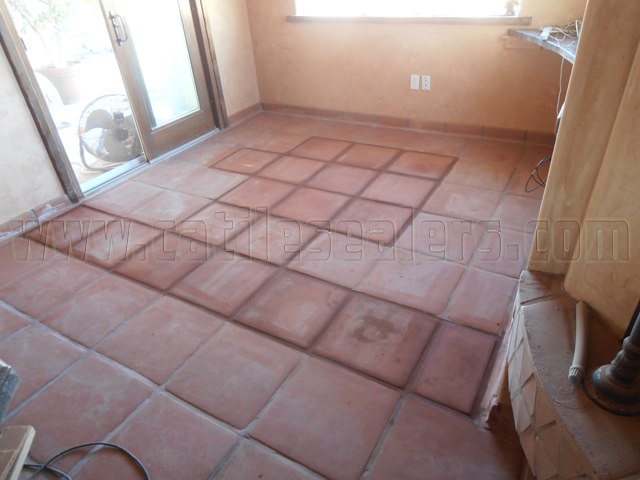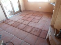 These Tecate paver tiles were worn out due to an office chair equipped with “carpet” casters instead of “hard floor” ones. The carpet casters are made from hard plastic and are abrasive on clay tile and natural stone floors. After years of rolling around on it, the surface of the tile gets worn away. The row of cracked tile is from settling which created movement between the existing slab and the one for the room addition.