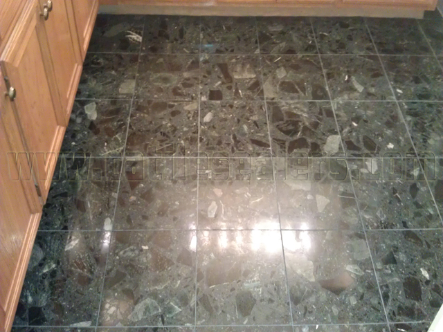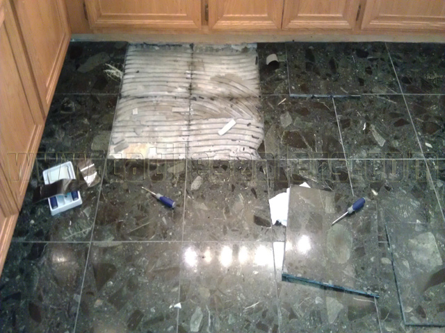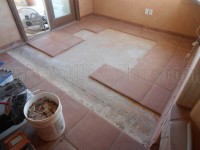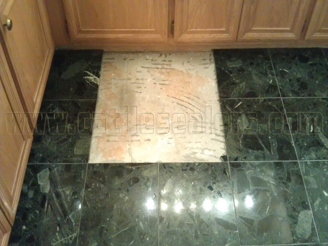 The repair was performed by removing the loose tiles, scraping the old mortar from the slab, and re-installing tiles. Eventually the entire floor was cleaned, diamond polished and sealed.