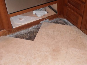 These natural stone tiles were loose due to a poor installation. The mortar on this install was mixed too dry causing the tile not to adhere properly. When the mortar is too dry, the tiles “sit on” the mortar rather than “sink into” it. Eventually the bond between the tile and mortar breaks, and the tiles become loose. This in turn causes the grout to crack.