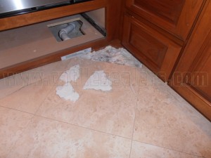 The pictures below depict what can happen as a result of slab leak. The white powdery substance is “efflorescence”. Basically efflorescence is a salt deposit that is brought to the surface by evaporating moisture. As the moisture passes through the slab, trying to escape, it carries the salt to the surface. Judging by the amount of efflorescence, this has been leaking for quite some time. The pressure created by the build up of salt between the slab and the stone was so great, that the stone fractured. The salt actually disintegrated the mortar as well.